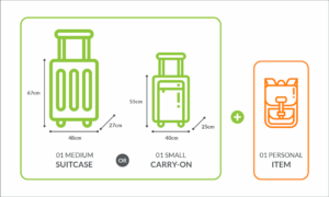 • 1 valigia media (67 × 48 × 27 cm) O 1 bagaglio a mano piccolo (55 × 40 × 25 cm)